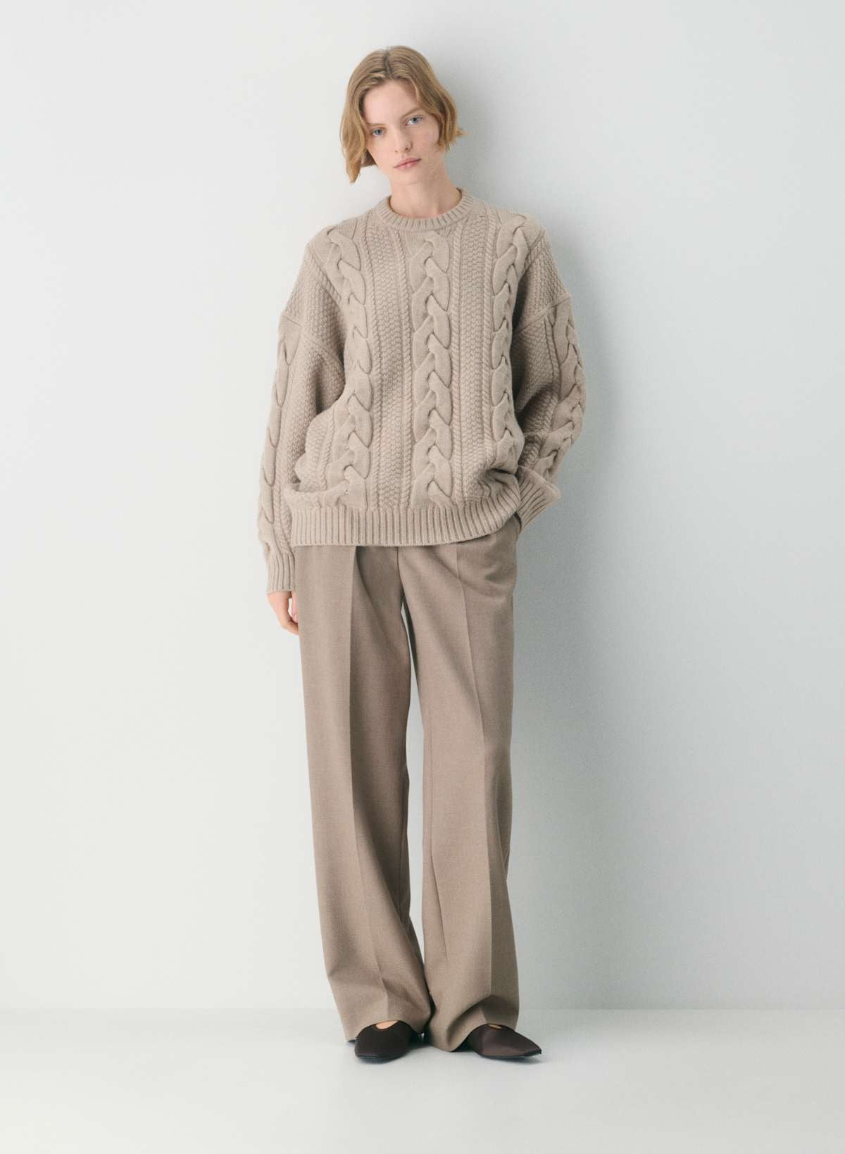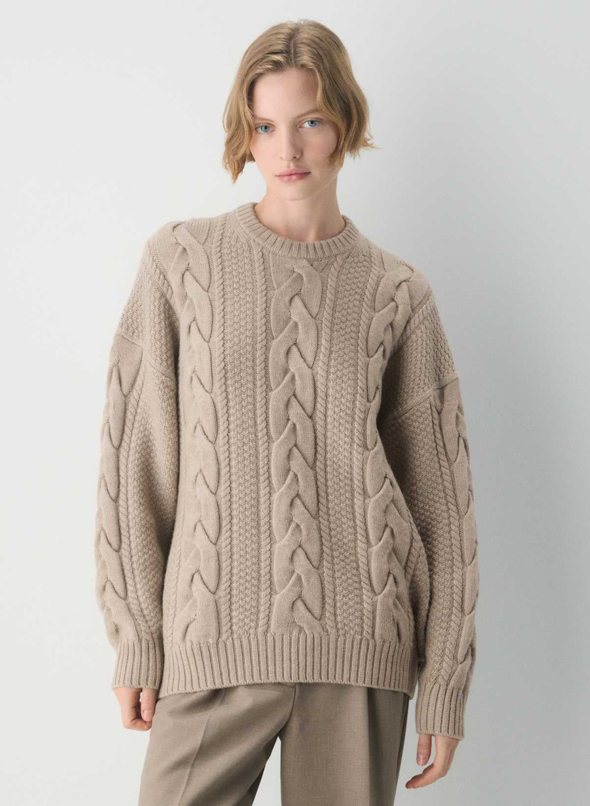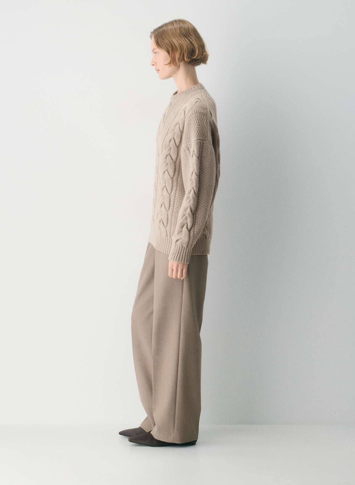 Dit is een trui met ronde hals en een ontspannen pasvorm. Hij is gebreid met Merinowol van Ariantz — een luchtig garen van 100% extra-fijne merinowol, geliefd om zijn natuurlijke warmte en zachte gevoel. Dit luxueuze garen is gemaakt van verantwoord verkregen wol. Deze versie is uitgevoerd met ons Anchor Cable-patroon, een kenmerkend motief met extra grote kabels voor een textuurrijk uiterlijk en gevoel.